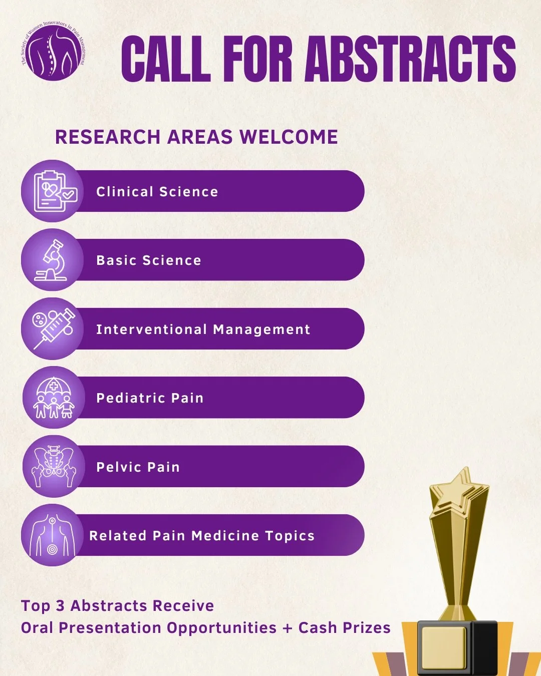 Abstracts are welcomed in clinical science, basic science, interventional management, pediatric pain, pelvic pain, and other related pain medicine topics.